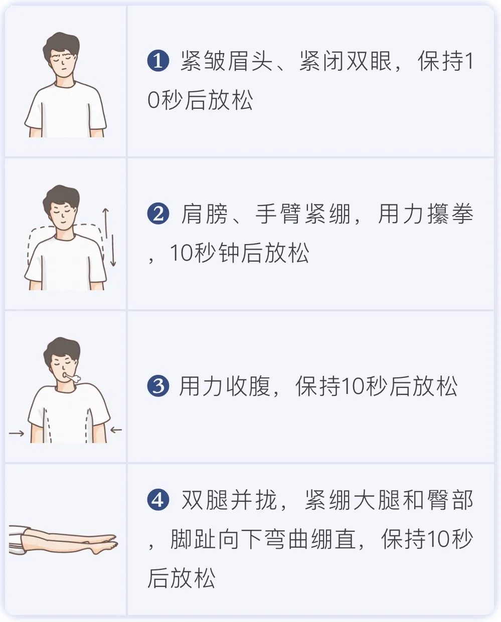 方法三 :先紧后松法先紧后松法可以让人记住肌肉从紧绷到放松的感觉,有助于深度放松全身的肌肉达到增进睡意的作用。
