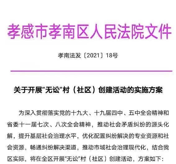 为贯彻落实党中央关于加强基层社会治理的决策部署,加快平安孝南、法治孝南建设进程,近日,孝南法院制定了《关于开展‘无讼’村(社区)创建活动的实施方案》,积极参与诉源治理,创新发展新时代“枫桥经验”。