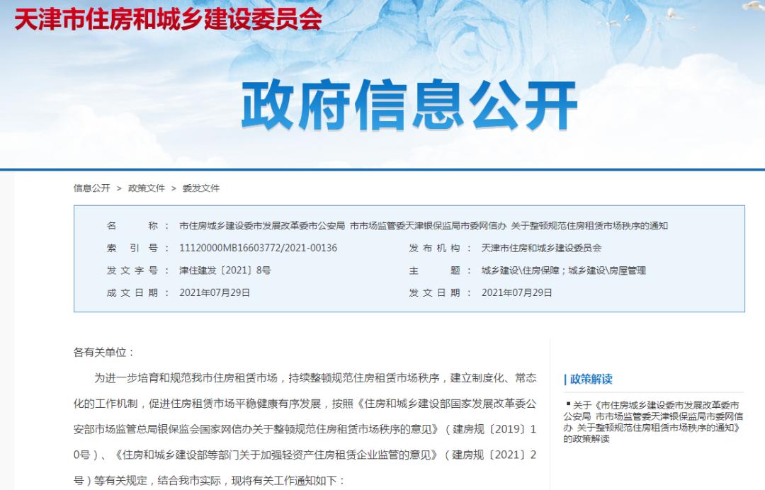 通知全文如下▼市住房城乡建设委市发展改革委市公安局 市市场监管委天津银保监局市委网信办 关于整顿规范住房租赁市场秩序的通知