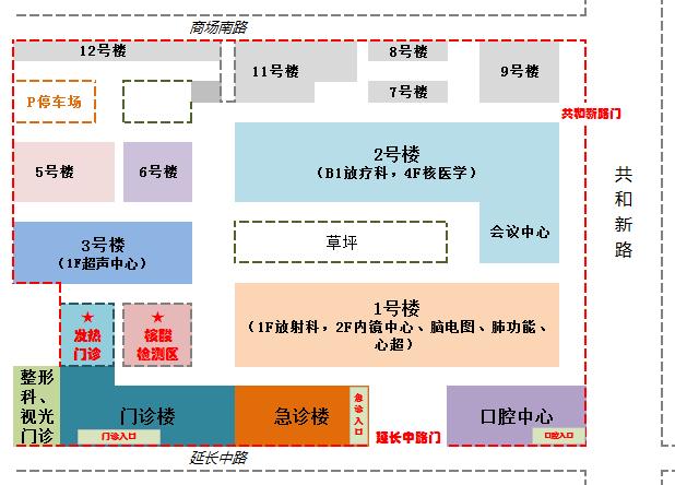 请您就诊时按照规定通道进入不同楼宇。门诊就诊请走门诊入口,急诊就诊请走急诊入口;口腔中心、整形科、视光门诊请从各自楼宇入口进入;核酸检测、检查、住院、陪护、探视等请从延长中路门(靠近口腔中心)。共和新路门仅为员工通道。