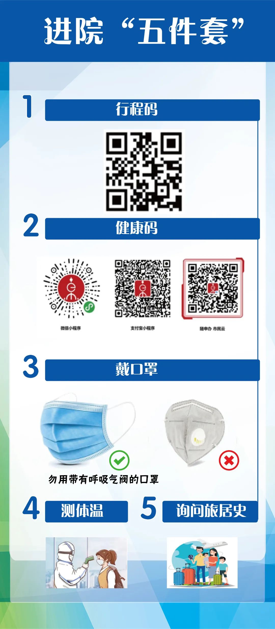 请提前准备好“双码”(行程码+健康码),经快速通道配合工作人员核验“五件套”,领取“通行证”(当日有效)后进入院区。