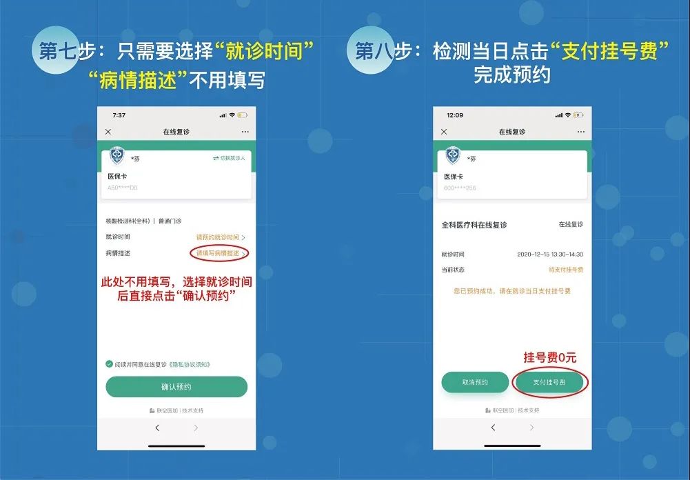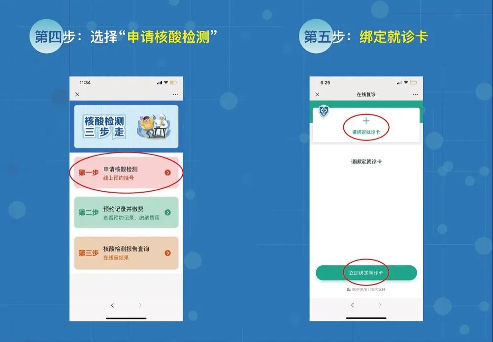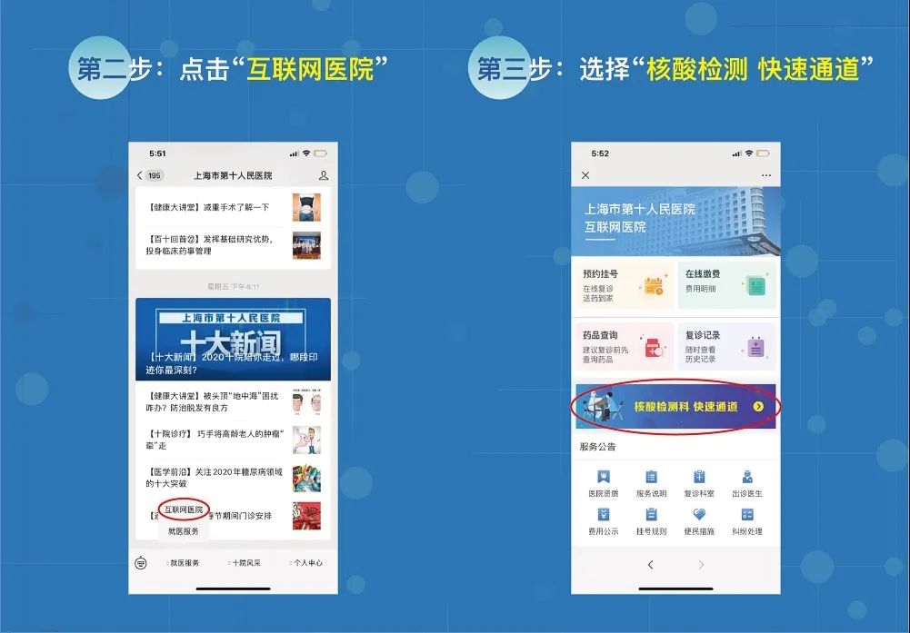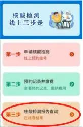 愿检人员可通过微信公众号【就医服务】-【互联网医院】-【核酸检测快速通道】进行线上申请、缴费、查询报告。