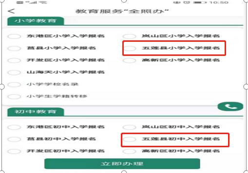 第二步:在“教育服务”中选择【五莲县小学入学报名】或【五莲县初中入学报名】进行报名。