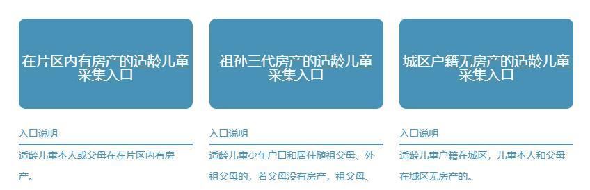 (1)【在片区内有房产的适龄儿童采集入口】:含房屋产权人与儿童在同一户籍、房屋产权人与儿童不在同一户籍2个采集分入口;(2)【祖孙三代房产的适龄儿童采集入口】;