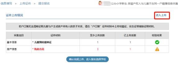 所有需要填报的信息填写完成后,点击【上传证件】-【进入上传】,根据招生政策要求上传相关证明材料照片。照片要确保清晰、完整、不变形。