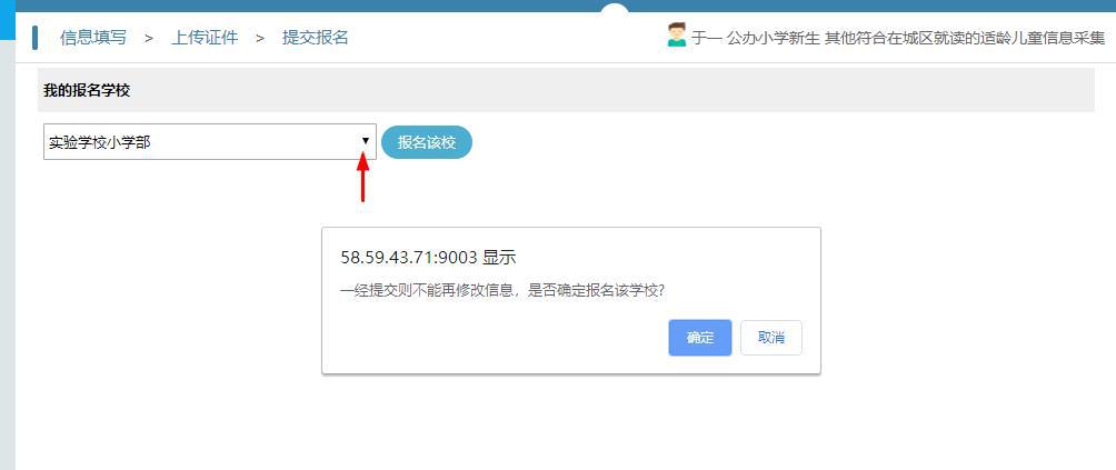 (四)提交报名点击【确认完成上传,进入报名选择学校】,在【我的报名学校】下拉框里选择报名学校,点击【报名该校】,弹出提示消息框“一经提交则不能再修改信息,是否确定报名该学校”,经两次确认后即提示报名成功。