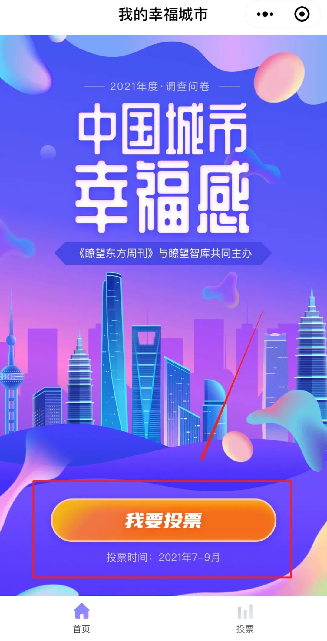 ②进入2021年度“中国城市幸福感”调查问卷活动界面后,点击“我要投票”按钮;