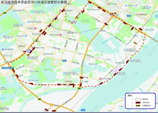 1.管控措施:三环线地面层(不含)—江永堤(不含)—烂泥湖堤(不含)—沌口新街(含)—东荆河路(不含)—东风大道及东风高架(不含)—体育路(含)—芳草路(不含)—三环线地面层(不含)合围区域为中风险管控区域,禁止区域内机动车、非机动车离开管控区域。