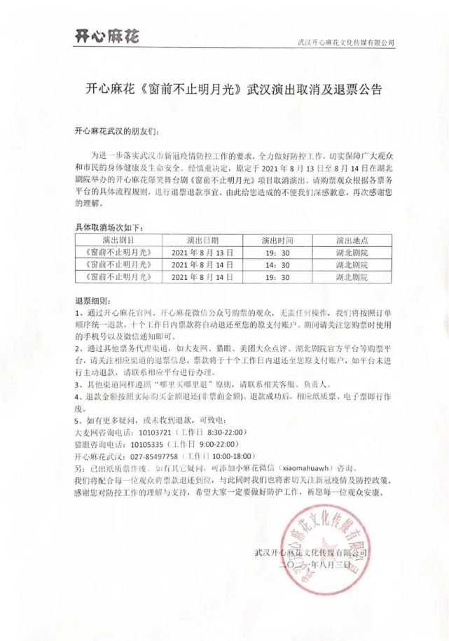原定于8月13日19:30和8月14日14:30/19:30的开心麻花爆笑舞台剧《窗前不止明月光》项目取消演出。请购票观众根据各票务平台的具体流程规则,进行退票退款。