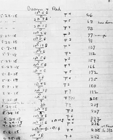 阿比·拉斯罗普女士记录小鼠培育繁殖过程的手稿1907年,哈佛大学的克拉伦斯·库克·利特尔(Clarence Cook Little)开始在导师的指导下,对小鼠皮毛颜色的遗传规律进行研究,经过二十多代的选择培育,世界上第一个纯种的近交品系小鼠(DBA小鼠)诞生了。与大家最熟悉的小白鼠不同,DBA小鼠的毛色不是纯白色,而是可以稳定遗传的浅棕色,实验用小白鼠的出现还要更晚一些。