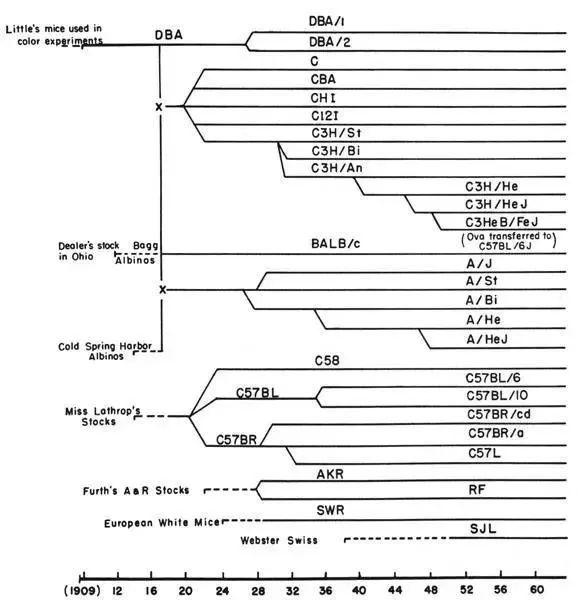 1912年,美国纽约纪念医院的哈希·巴格(Halsey J.Bagg)购得一批白化小鼠原种,经过多代近交培育,最终获得品系名为BALB/c的白化小鼠品系。