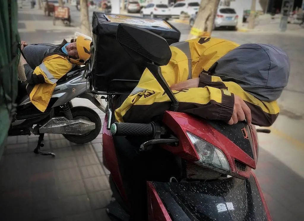 2020年3月20日,石家庄,在路边休息的送餐员。(图源:CFP)这1.74亿中,既包括小工厂的工人,也有相当数目的零工,即“灵活就业”者,如网约车司机、家政、保洁、外卖和快递等。人社部相关负责人在2020年8月公布,中国灵活就业人数在2亿人左右,受疫情冲击,仅2020年一季度,灵活就业人数就增长了20%左右。这其中有近千万的外卖骑手,根据2020年的数据,美团有950万注册骑手,而饿了么平台有300万。骑手分为两种,全职的叫“专送”,兼职的叫“众包”,无论哪一个都没有社保。