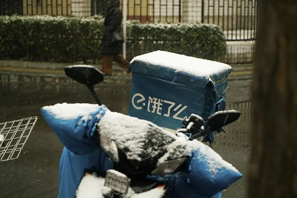 2019年12月16日,北京,大雪中的饿了么外卖车。(图源:CFP)对雇主来说,雇主责任险的优势在于省钱。“如果算上个人和单位应缴,一个4000元月薪的工人每个月要缴纳1000元的社保,”在广州从事工人权益相关工作的律师张笑(化名)说,而一份雇主责任险,全年也不超过千元。
