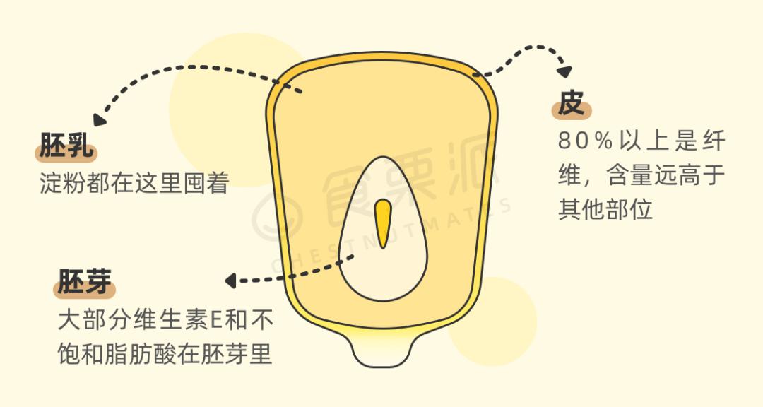 由于保留了种皮,每100g玉米的膳食纤维含量达到了6-8g,远高于糙米(3.4g/100g,中国食物成分表)。