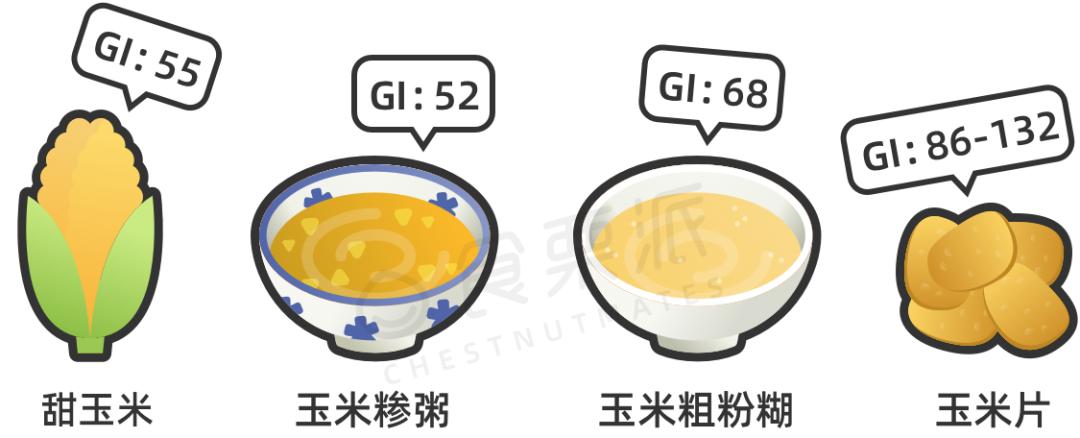 玉米粉煮粥时,熬煮过程又会促进淀粉的水解,虽然口感更好,但会提高GI值。对需要控制血糖的人来说,玉米饼之类水分少的做法会更好一些。