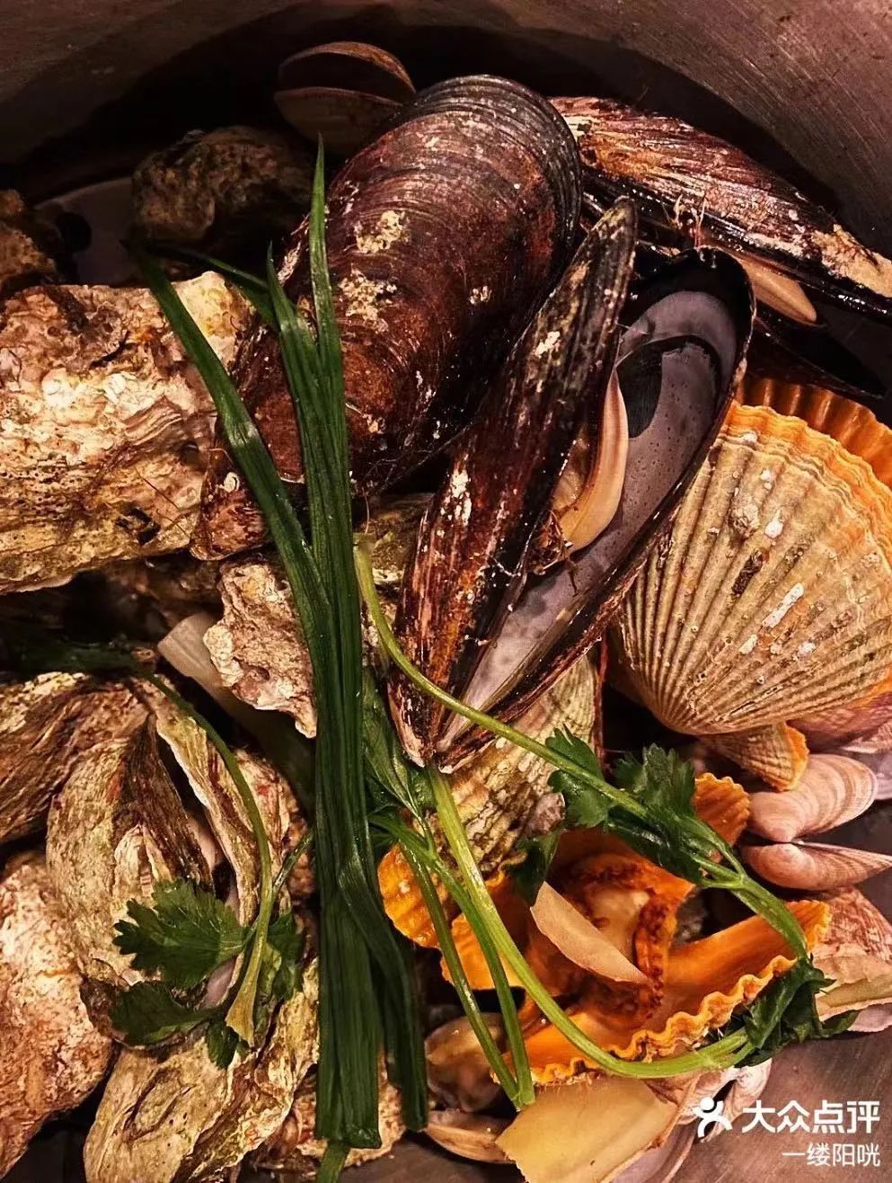 他家的高压锅生蚝是招牌,还有分量很足的一大锅蒸海鲜,里面就有生蚝、扇贝、花甲等。