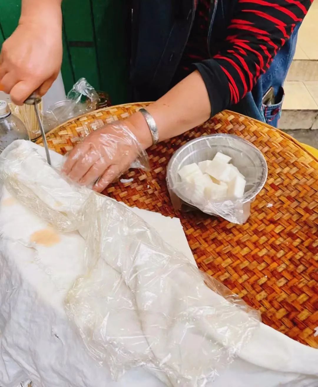 这家店在「创新路113号」,他家的簸箕炊是一整块,要多少就切多少来称,称好后切小。