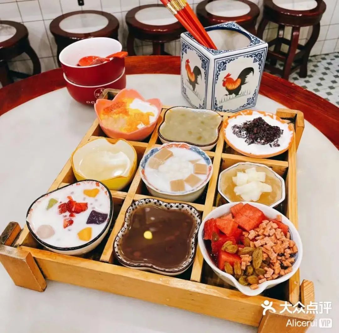 他家现在有比较流行的「糖水九宫格」,里面包含了杨枝甘露、玉米马蹄、绿豆沙等经典糖水系列。