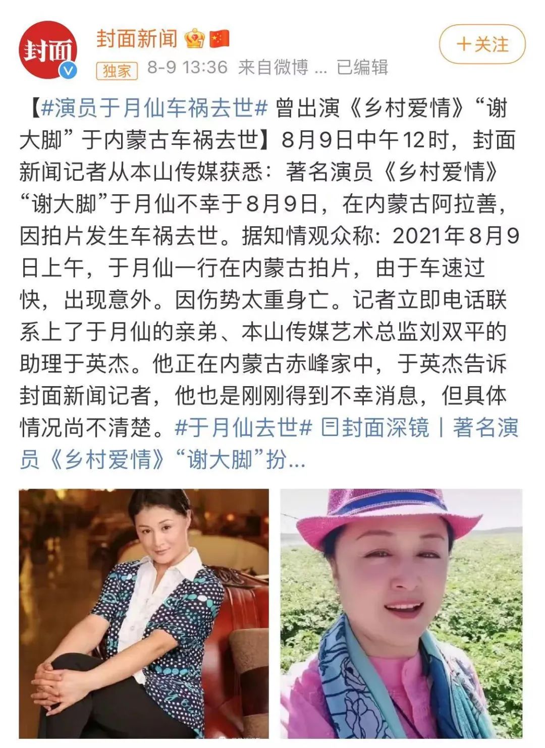 据封面新闻消息、本山传媒证实:著名演员于月仙于8月9日在内蒙古不幸遭遇车祸去世。