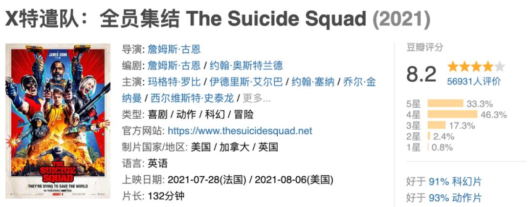 说没想到它会爆,是因为这部的前作实在是不争气。5年前的《自杀小队》豆瓣只有6.6分,烂番茄新鲜度只有可怜的26%。