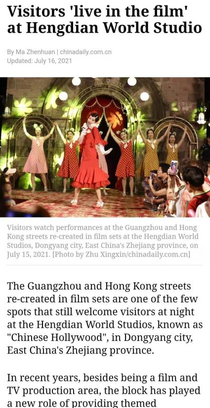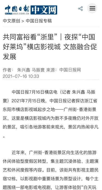 《共同富裕看“浙里”|夜探“中国好莱坞”横店影视城 文旅融合促发展》2021年7月15日晚,中国日报记者探访浙江省东阳市横店影视城起步之地——广州街·香港街景区,这里是横店影视城内为数不多夜晚仍对外开放的景区,吸引各地游客前来观光,景区内热闹非凡。