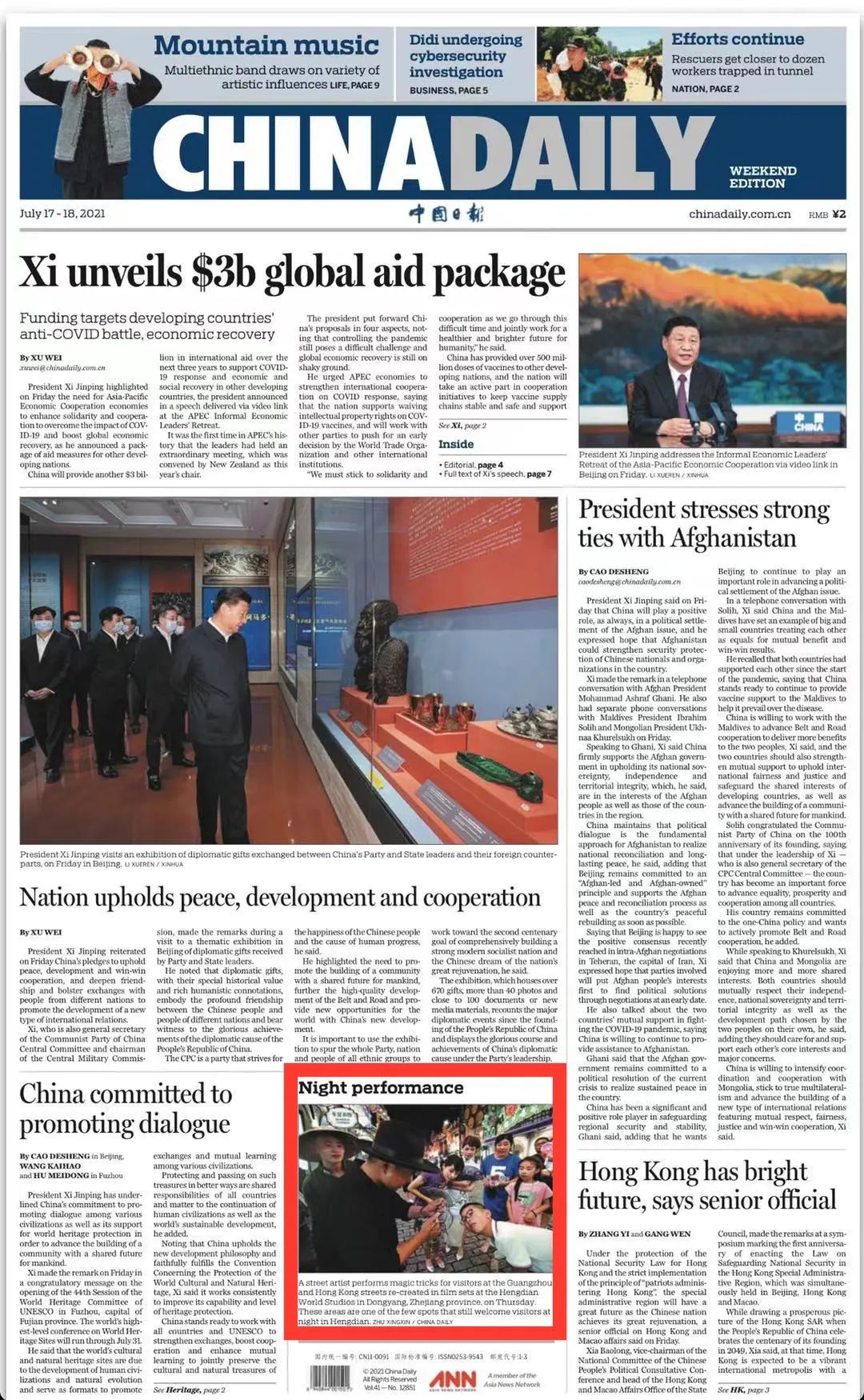 China Daily(中国日报)头版图文结合关注横店影视城文旅融合促发展。