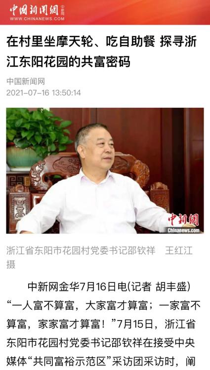 《在村里坐摩天轮、吃自助餐 探寻浙江东阳花园的共富密码》“一人富不算富,大家富才算富;一家富不算富,家家富才算富!”7月15日,浙江省东阳市花园村党委书记邵钦祥在接受中央媒体“共同富裕示范区”采访团采访时,阐释着自己对于共同富裕的理解。