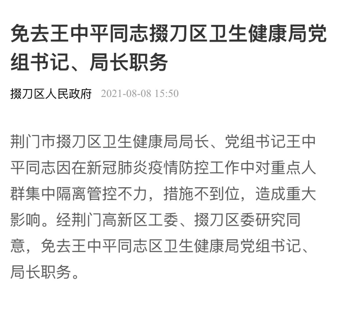 据湖北荆门掇刀区人民政府消息,经荆门高新区工委、掇刀区委研究同意,免去王中平同志掇刀区卫生健康局党组书记、局长职务,其免职按有关法律规定办理。(央视新闻)“踹门查补课”后续来了!两人被处理