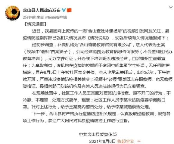 经初步调查,补课机构为“含山青聪教育咨询有限公司”,法人代表为王某(视频中“老师”贾某妻子),公司经营范围为教育信息咨询服务(不含营利性民办教育培训),无办学许可证,开办线下培训班系违法经营,且涉嫌招生虚假宣传;为牟取利益,该机构在疫情防控期间于密闭空间集聚学生补课,无任何防护措施,且在8月5日上午被社区责令关停、本人也承诺关闭后,出尔反尔,下午继续开班,严重违反疫情防控相关禁令;视频中“老师”贾某既非在职教师、也无教师资格证。县相关部门对该机构及有关人员违法违规行为已立案调查。