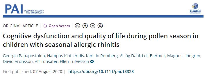 [5]Cognitive dysfunction and quality of life during pollen season in children with seasonal allergic rhinitis DOI:10.1111/pai.13328