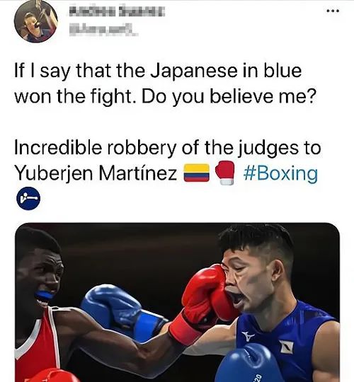 进一步说,不公平的竞赛环境所影响的不光是我们中国,还有世界上所有那些凭真本事参加比赛的运动员——比如拳击项目男子蝇量级1/4决赛中,把日本选手田中亮明打到昏厥,而自己状态良好只是有点喘,最后却被以1:4比分裁定落败的哥伦比亚名将尤伯珍·亨尼·马丁内斯·里瓦斯。