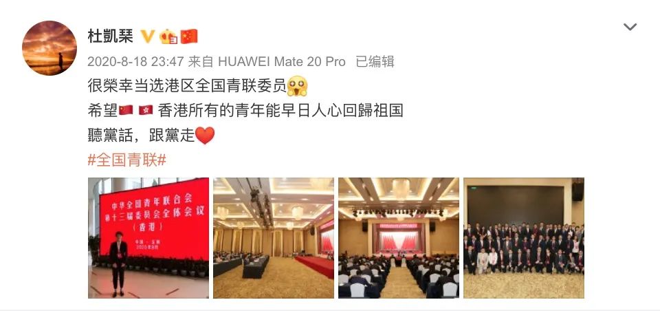这位在香港回归前一年出生的年轻运动员,在帮助中国香港女乒历史性的赢得首枚奥运奖牌后,一条她在去年发布的微博突然就火了。在这条宣布自己当选港区全国青联委员的微博中,杜凯琹说,“希望中国香港所有的青年能早日人心回归祖国。听党话,跟党走。”