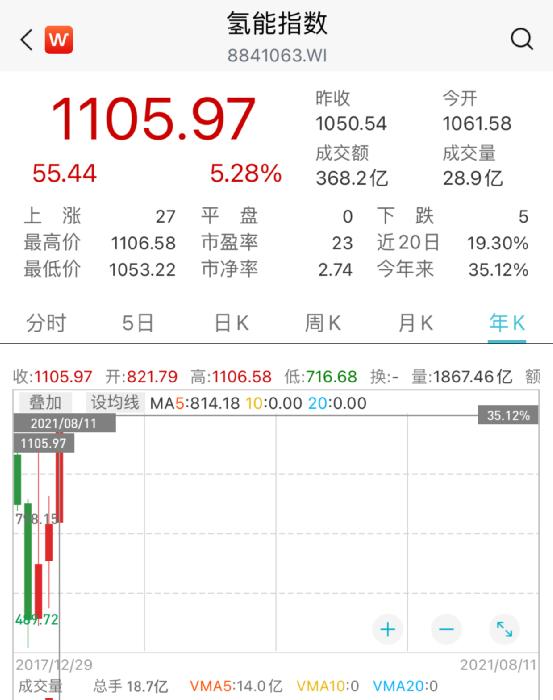 截止8月11日,今年以来,Wind氢能指数累计涨幅超35%,并且最近几天也没有受到新能源板块疲弱的影响,依然正在“奋力向上”。从成分股构成来看,包括:宝丰能源、凯美特气、卫星石化、雪人股份、安泰科技、厚普股份、美锦能源、嘉化能源、福田汽车、长城电工、凯龙股份、华昌化工、上汽集团、贵研铂业、江苏阳光、长盈精密、动力源、隆基股份、东方钽业、三环集团等32只个股。