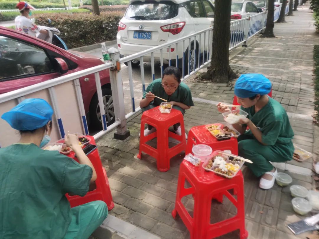 为了减少社区工作人员和志愿者的危险,汤闪闪一组4人采完核酸后选择蹲在马路边吃午饭,把休息室留给更辛苦的社区工作人员和志愿者。“这种互相为对方着想的感觉就像家人一样。”汤闪闪说。这里的孩子都是英雄!
