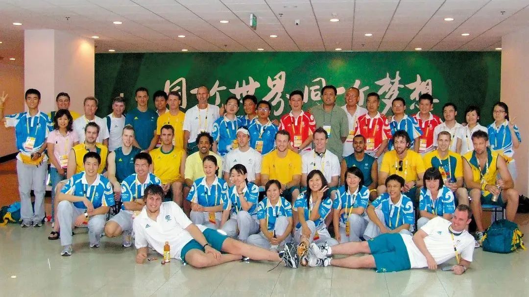 澳大利亚男队在清华大学体育馆训练后和工作人员合影