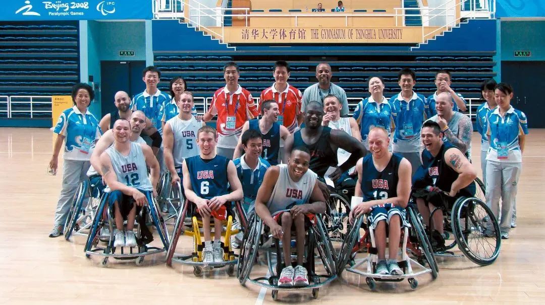美国轮椅篮球男队在清华大学体育馆训练后和工作人员合影
