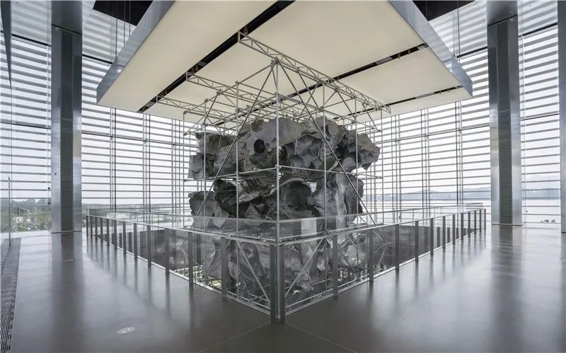 五号展厅234块巨型超级白色玻璃紧密拼合成高22米的立方体,展览空间约10,000立方米,被称为“超白玻璃盒子”。