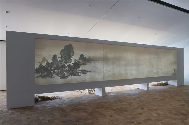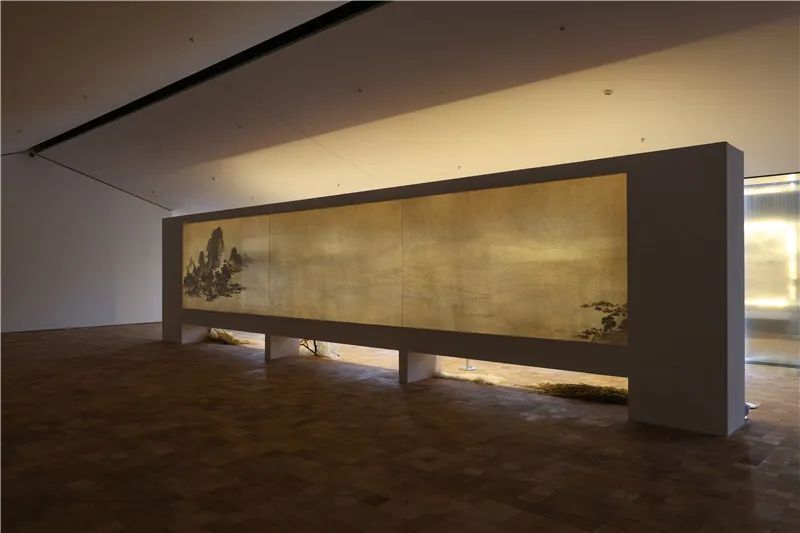 徐冰今年最新创作的《背后的故事:烟江叠嶂图》在这里展示,透过宣纸玻璃中树木与山水朦胧的轮廓,展现在观众眼前的是一幅具有东方韵味的水墨山水画。但当观众走到作品背后,看到的却是树枝、麻丝、棉布等不起眼的废料时;原,这幅极具东方韵味的山水画,是由这些杂物的型与光的作用呈现的。这是艺术家徐冰创造的一种“光和空气的绘画”,它不是由颜料、画布、纸张等绘画性材料形成的画面,而是通过对渗透于空气中光的调配;通过这块从空间中穿过的宣纸玻璃,光的形影被记录。这块毛玻璃的作用好比是空气中光的切片。可以说,我们眼前所看到的并非一幅真实存在的绘画。作者用艺术的方式,对存在、真实、虚无这些命题做了讨论。