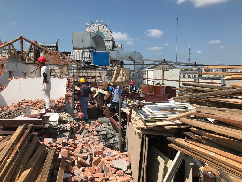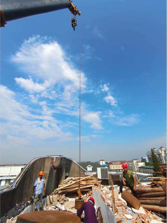 处置过程商厦位于镇区主干道旁边,周边人流量大,环境极其复杂,楼顶搭建棚屋“犬牙交错”分布,现场还涉及整栋楼的通风排气、用水用电、燃气安全等方面,高空整治作业难度系数大,给拆违行动带来一定难度。且由于位置特殊,人员上下基本靠电梯,楼梯通道较为狭窄,可供搬运和作业的空间十分有限,所以如何将拆除后的建筑垃圾清运下楼成为了一个难点。