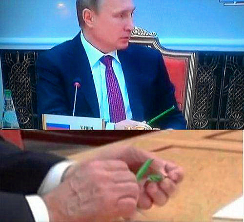 但普京的吃货属性并不是那么有名,普京有另一个举世无双、名震全宇的技能——他能把笔立起来,厉不厉害?