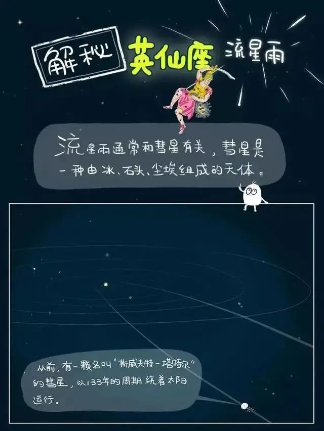 英仙座流星雨就是这样形成的 | EasyNight英仙座流星雨就是斯威夫特-塔特尔彗星(comet Swift-Tuttle)撒落的碎屑与地球相遇的结果。这颗彗星每130年环绕太阳一圈。地球会在每年8月穿过这颗彗星的轨道。