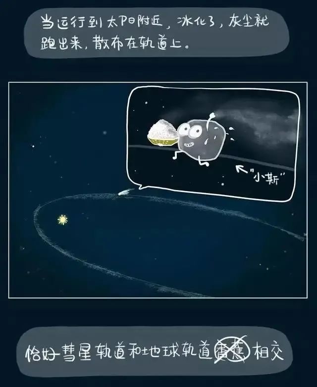流星雨之所以出现,是因为地球环绕太阳的公转轨道上,多少散布着一些彗星(偶尔也有小行星)撒落的碎屑。