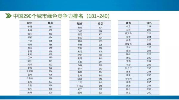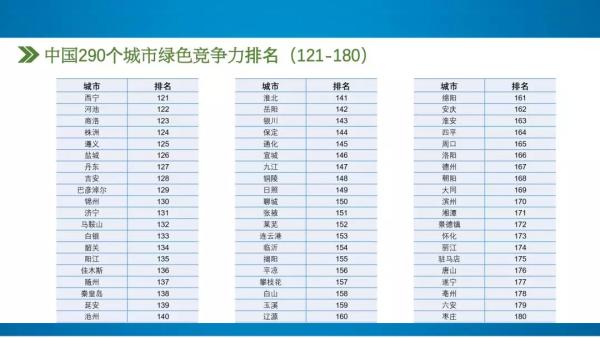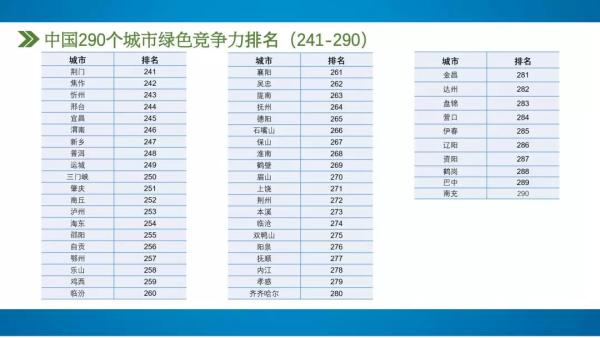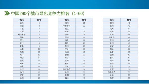 根据2016年的数据测算显示,城市绿色竞争力综合指数排在前20位的城市依次是:北京、深圳、三亚、广州、鄂尔多斯、西安、厦门、长沙、青岛、上海、东莞、海口、南宁、庆阳、威海、南京、杭州、梅州、安康和天津。中国城市绿色竞争力指数平均值为0.2434,其中,有125个城市的绿色竞争力指数高于平均水平,165个城市的绿色竞争力指数低于平均水平。