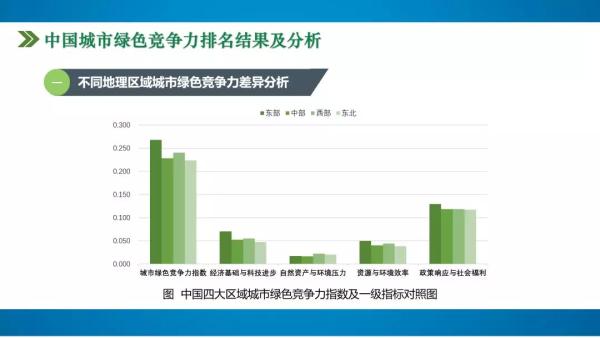 从不同区域对比来看,在全国125个城市绿色竞争力综合指数高于平均水平的城市中,东部地区城市有61个,几乎占到总数的一半,中部地区城市有17个,西部地区城市有40个,东北地区城市仅有7个;区域内部中东部地区绿色竞争力优势明显,中部地区城市绿色竞争力较东部地区处于明显劣势。