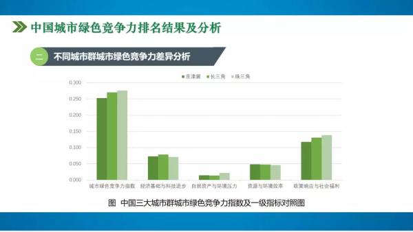 从不同城市群对比来看,长江三角洲城市绿色竞争力遥遥领先,珠江三角洲城市群城市稍强,京津冀城市群中的城市较为落后。其中,呼包鄂榆城市群所有测评城市的平均水平达到0.2964,远高于其他城市群。