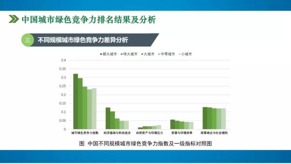 从不同城市规模对比来看,超大城市所有测评城市的平均水平达到0.3217,远高于其他地区。特大、大、中、小城市的平均水平分别为0.2969、0.2471、0.2313、0.2377,均低于超大城市水平,其中中等城市和小城市绿色竞争力指数低于全国平均水平的0.2434。