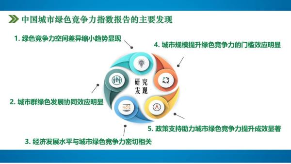 研究发现,中国城市绿色竞争力发展呈现五个特征:一是中国绿色竞争力空间差异缩小趋势显现;二是城市群绿色发展协同效应明显;三是经济发展水平与城市绿色竞争力密切相关;四是城市规模提升绿色竞争力的门槛效应明显;五是政策支持助力城市绿色竞争力提升成效显著。