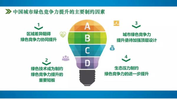 中国城市绿色竞争力提升有四个制约因素:一是区域差异阻碍绿色竞争力协同提升;二是绿色技术成为制约绿色竞争力提升的重要短板;三是城市绿色竞争力提升亟待加强顶层设计;四是生态问题制约绿色竞争力的进一步提升。