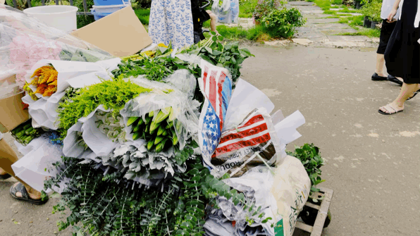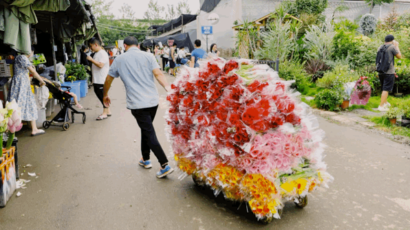 在门口就能看到,商贩们拉着一车车的鲜花正往市场里挨着运送