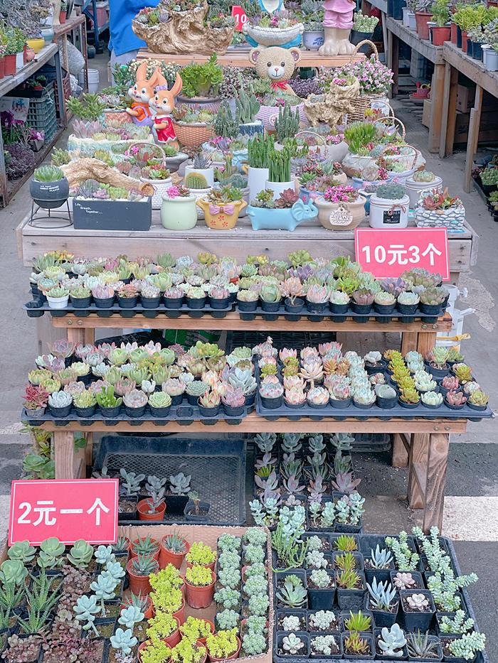 这里的摊位卖的基本都是居家养花的盆栽花、多肉系列。多肉2元/个,10元/3个,10元/5个
